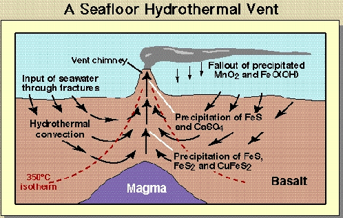 In some areas along the Mid-Ocean Ridge, the gigantic plates that form the Earth's crust are moving apart, creating cracks and crevices in the ocean floor. Seawater seeps into these openings and is heated by the molten rock, or magma, that lies beneath the Earth's crust. As the water is heated, it rises and seeks a path back out into the ocean through an opening in the seafloor. As the vent water bursts out into the ocean, its temperature may be as high as 400 oC. Yet the water does not boil because of the incredible pressure from the mass of the ocean.