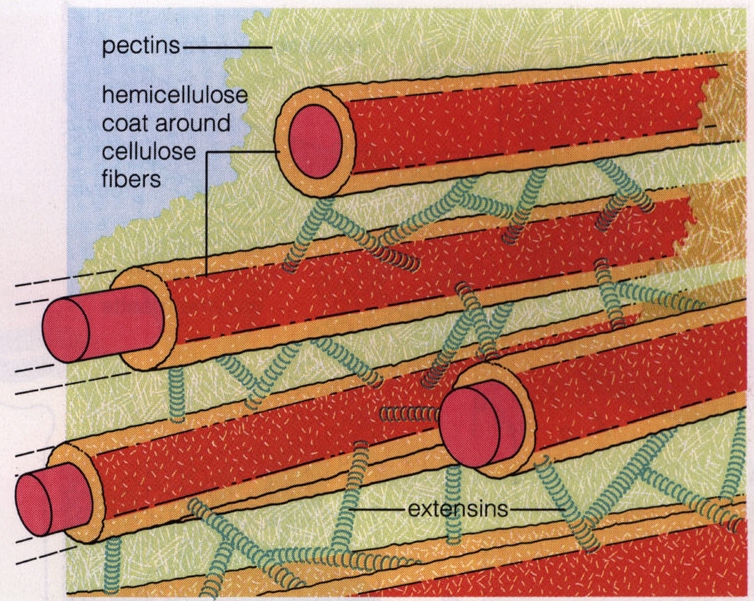 1. Extensins confer rigidity to cell wall via ionic attractions with negatively charged network components and covalent bonds with other extensins and pectins