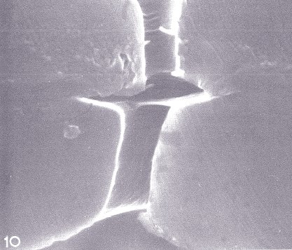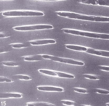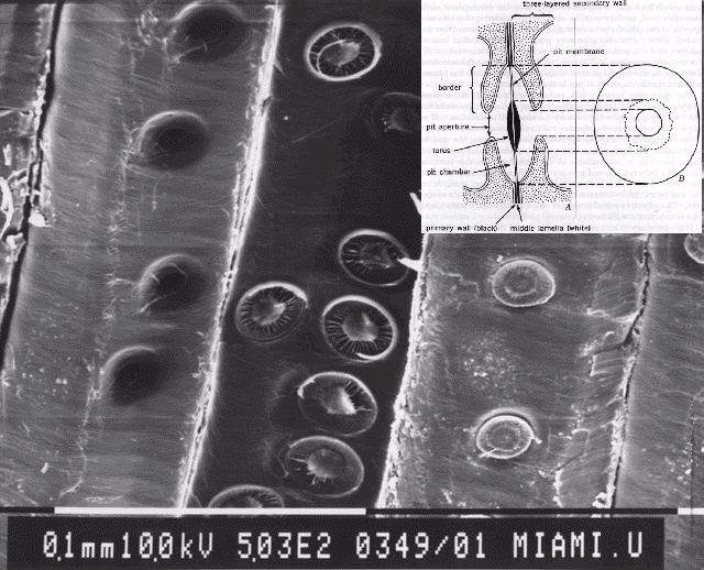 4. Circular pit chamber with much larger elliptical pit canal (SEM View) (Fiber-Tracheids)