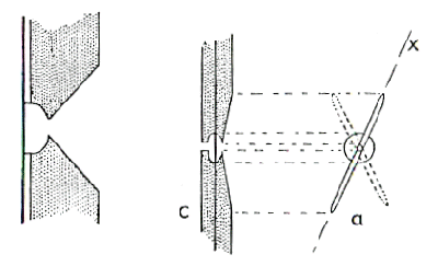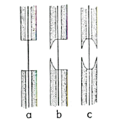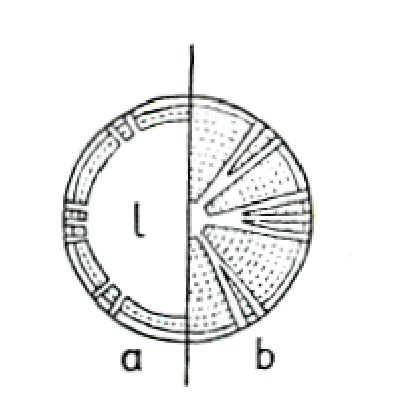 b. Bordered pits: Pit canal <> Pit chamber in size and shape