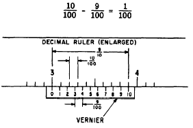 Suppose a ruler has markings every tenth of an inch but it is desired to read accurately to hundredths. A separate scale (fig. 6-3) is added to the ruler. It has 10 markings on it that take up the same distance as 9 markings on the ruler scale. Thus, each space on the vernier is 1/10 of 9/10 inch, or 9/100 inch. How much smaller is a space on the vernier than a space on the ruler? The ruler space is 1/10 inch, or 10/100 and the vernier space is 9/100 inch. The vernier space is smaller by the difference between these two numbers, as follows: