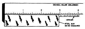 Each vernier space is 1/100 inch smaller than a ruler space. As an example of the use of the vernier scale, suppose that we are measuring the steel bar shown in figure 6-4. The end of the bar almost reaches the 3-inch mark on the ruler, and we estimate that it is about halfway between 2.9 inches and 3.0 inches. The vernier marks help us to decide whether the exact measurement is 2.94 inches, 2.95 inches, or 2.96inches.