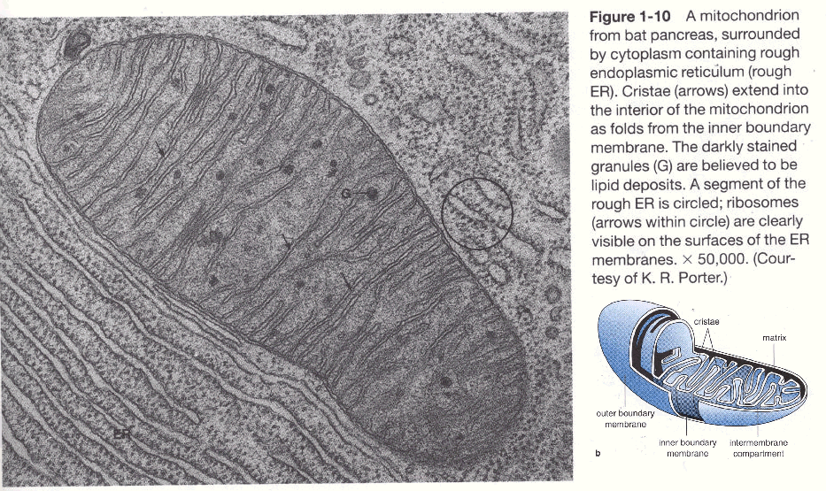 1. Double membrane bound structure with tubular or plate like projections in interior (Cristae) which contain enzymes for electron transport system (oxidative phosphorylation)