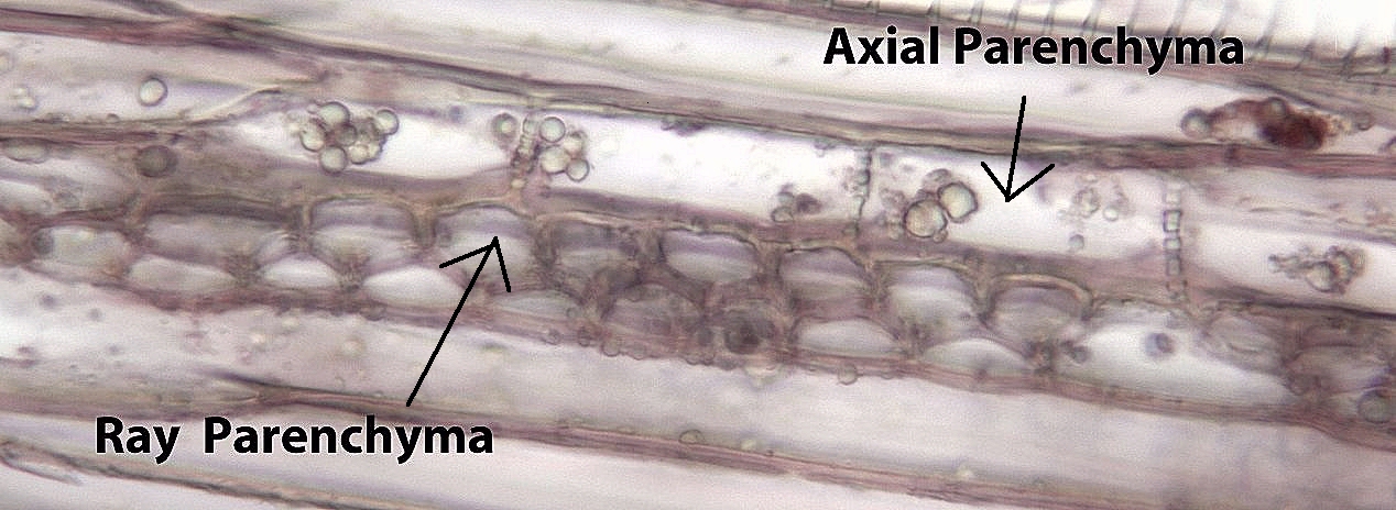 In secondary xylem: Uniformly thick, lignified secondary wall with simple pits. Two subcategories on basis of 3-D geometry (Ray and Axial) |